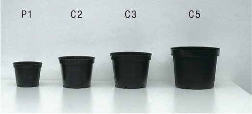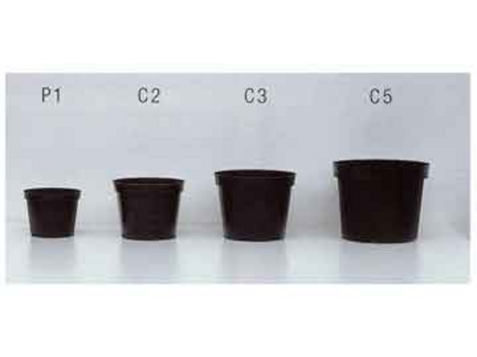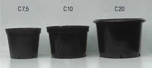 Die Übersicht zeigt die in Baumschulen gängigen Containergrößen (P = Topf, C = Container). Zwischengrößen sind durchaus möglich und in Gebrauch. Solitärs werden in Containern ab 20 Liter kultiviert, bei Schlingpflanzensolitärs sind es 7,5 Liter und bei Solitärhochstämmen 90 bis 285 Liter.