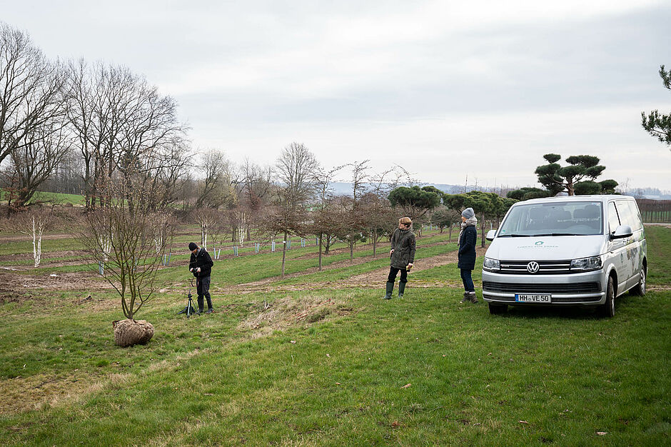 Anfang Januar fanden bereits Testaufnahmen in der Baumschule Lorberg (Tremmen) statt. Am 20. März wurden schließlich die ersten Aufnahmen in den Baumschulen Lorenz von Ehren (Hamburg) und Clasen (Rellingen) gemacht, die im Rahmen der BdB-Sommertagung in Schwäbisch-Hall gezeigt und diskutiert werden sollen. Wir danken den Baumschulen für ihre freundliche Kooperation.