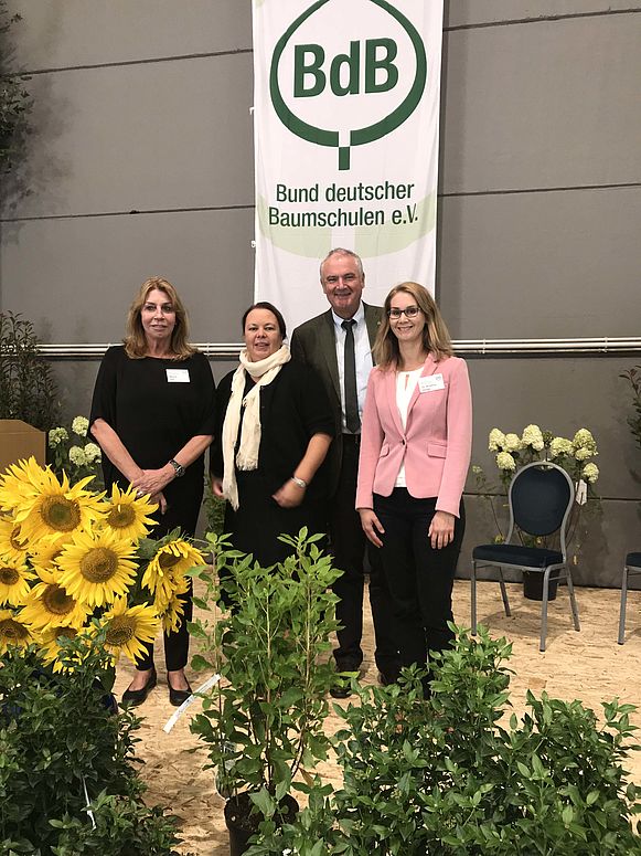 Die Festredner v.l.n.r.: Marita Ley, Geschäftsführerin und Mitinhaberin Baumschule Wilhelm Ley, Ursula Heinen-Esser, Ministerin für Umwelt, Landwirtschaft, Natur- und Verbraucherschutz des Landes Nordrhein-Westfalen, Helmut Selders, Präsident des Bundes deutscher Baumschulen (BdB), Dr. Kristina Haage, Vorsitzende der ARGE Baumschulforschung. Foto: BdB