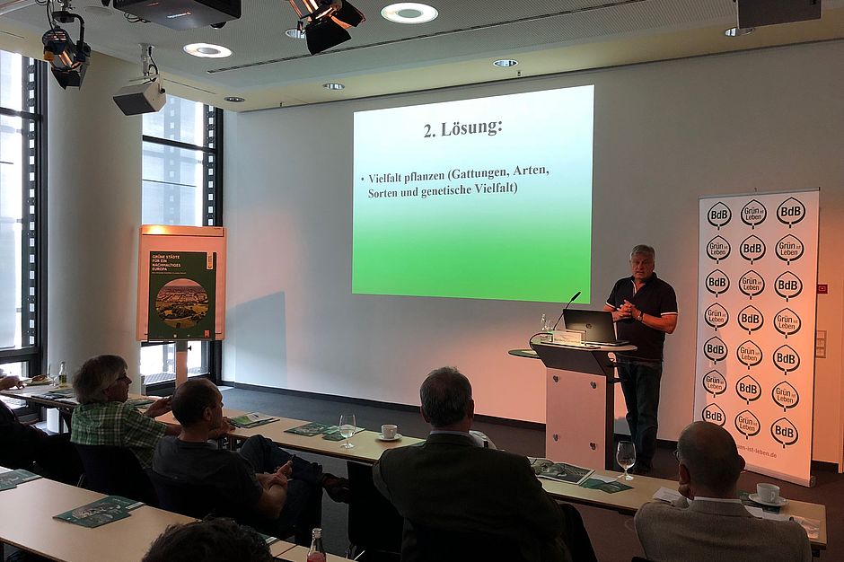 Prof. Dr. Dirk Dujesiefken vom Institut für Baumpflege ging in seinem Vortrag über die Perspektiven für ein zukunftsfähiges Stadtgrün auf die Probleme ein, die durch Urbanisierung, Klimawandel und mangelnde Biodiversität entstehen: „Die Verteidigung der Grünflächen muss höchste Priorität haben“, forderte Dujesiefken. „Wir müssen uns von einem ‚einheitlichen‘ Bild der Bäume lösen und stattdessen verschiedene Gattungen, Arten und Sorten pflanzen, um die genetische Vielfalt zu gewährleisten.“