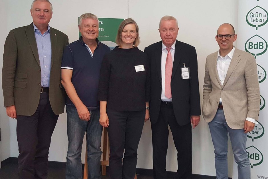 BdB-Präsident Helmut Selders, die Referenten Prof. Dr. Dirk Dujesiefken (Institut für Baumpflege), Prof. Dr. Swantje Duthweiler (Hochschule Weihenstephan-Triesdorf) und Horst J. Schumacher (Chefredakteur "Kommunalwirtschaft), sowie BdB-Hauptgeschäftsführer Markus Guhl