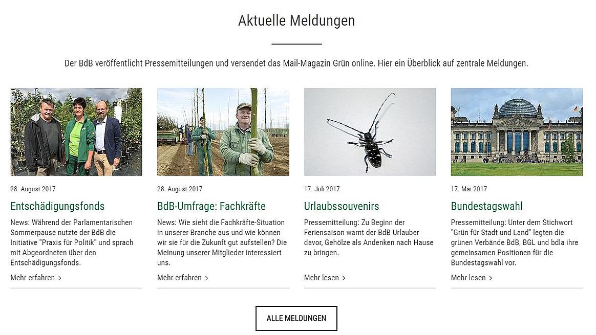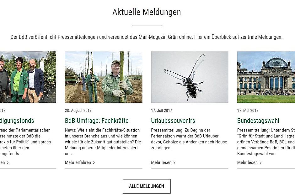 Mitte Februar fand der Abstimmungstermin "Contentaufbereitung, Tonalität und Inhalte" und Anfang März der Abstimmungstermin "Kampagnenseiten / Microsites" mit der Agentur statt. Im Mai wurden fünf Mitarbeiter der Bundesgeschäftsstelle in der Contentsoftware der neuen Website geschult. Als erste Übung zur Contenterstellung wurden die Kampagnenseiten der ZgG befüllt. In einem nächsten Schritt folgten die neue Bühne der Homepage und die exemplarische Gestaltung von Übersichts- und Inhaltsseiten. Die Überarbeitung der Website wird auch zum Anlass genommen, viele Texte neu zu schreiben und in diesem Zuge zu aktualisieren. Die uns begleitende Agentur hat die neue BdB-Website aktuell schon auf einen Live-Server umgezogen und richtet diesen nun ein. Im Anschluss wird der Mitgliederimport integriert, die Baumschulsuche und die Suche nach Inhalten abgeschlossen. Momentan laufen die alte und die neue Website im Parallelbetrieb (die neue noch nicht öffentlich). Nach der Umstellung von www.gruen-ist-leben.de werden alle Mitglieder benachrichtigt und ihnen ihr Zugang für den Mitgliederbereich geschickt. Bei Vergessen des Passwortes können die Mitglieder dieses zukünftig selber neu generieren und müssen sich nicht extra dafür an die Bundesgeschäftsstelle richten.