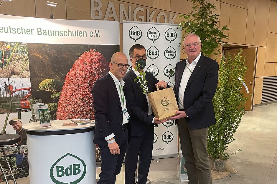 Dass der Parteitag auch wirklich grün war, dafür sorgte in Kooperation mit dem BdB zum einen die Baumschule Ley, die mit einer beeindruckenden Auswahl an Gehölze nicht nur den BdB-Stand, sondern den ganzen Parteitag ausstattete. Darüber hinaus ermöglichte es die Baumschule Reinke, dass auch in Bonn wieder Setzlinge der Rot-Buche, der Baum des Jahres 2022, verteilt werden konnten und schöne Gesprächsanlässe und -einstiege boten.