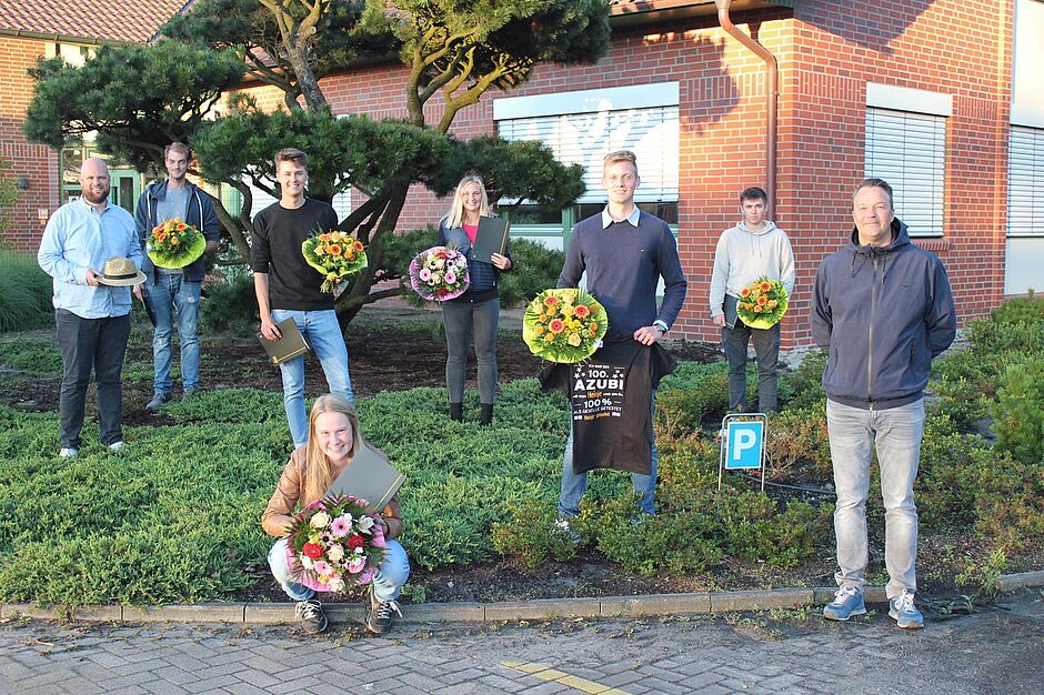 Timo Hülsmann ist der 100. Azubi, der seine Ausbildung in der Baumschule Diderk Heinje erfolgreich abgeschlossen hat. Gemeinsam mit Timo Hülsmann konnten sechs weitere Azubis ihren Berufsabschluss zum Baumschulgärtner feiern. „Erfahrungsgemäß sind unsere besten Mitarbeiter die, die wir selbst ausgebildet haben“, erklärt Ausbildungsleiter Jan Euteneuer.