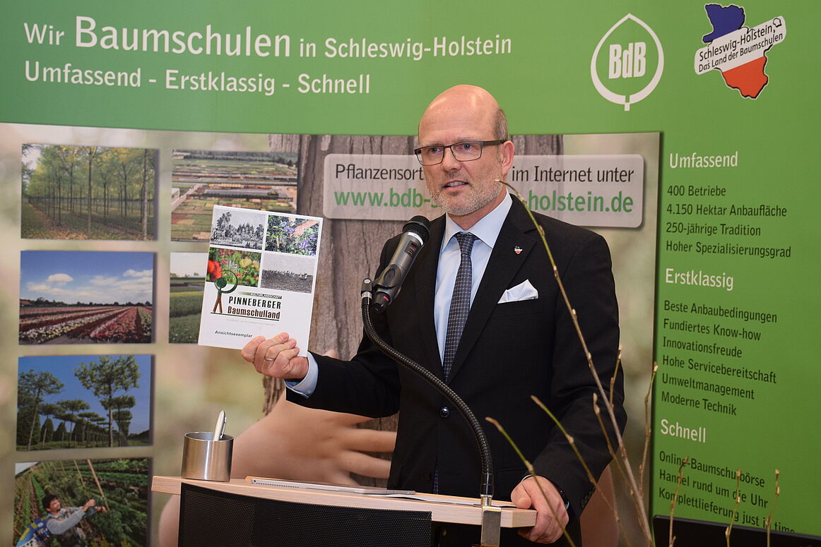 Axel Huckfeldt, Vorsitzender des BdB Schleswig-Holstein, konnte viele Ehrengäste aus Landtag und Kreistag, Bürgermeister und Vertreter aus Verwaltung und Wirtschaft zur Wintertagung seines Verbandes begrüßen. Zunächst erinnerte er an das Hitze- und Dürrejahr 2018, das vor allem in Baumschulen mit Freilandproduktion zu erheblichen Schäden an den Kulturen und betrieblichem Mehraufwand führte. Huckfeldt: „Die Schäden an unseren Kulturen durch die extreme Nässe im Herbst 2018 und die extreme Hitze und Trockenheit im Sommer 2018 sind enorm. Sie werden die Betriebe noch einige Jahre belasten, da unsere Gehölze Produktionszeiten von bis zu 10 Jahren und länger haben. Die Dürrehilfe der Bundesregierung konnte auch aus diesem Grund nur von den allerwenigsten Baumschulen beantragt werden. Wir fordern daher nach wie vor als Hilfe zur Selbsthilfe eine steuerfreie Risikorücklage einzuführen. Die aus dem Klimawandel resultierenden Risiken werden sonst von den Betrieben nicht mehr zu kompensieren sein!“