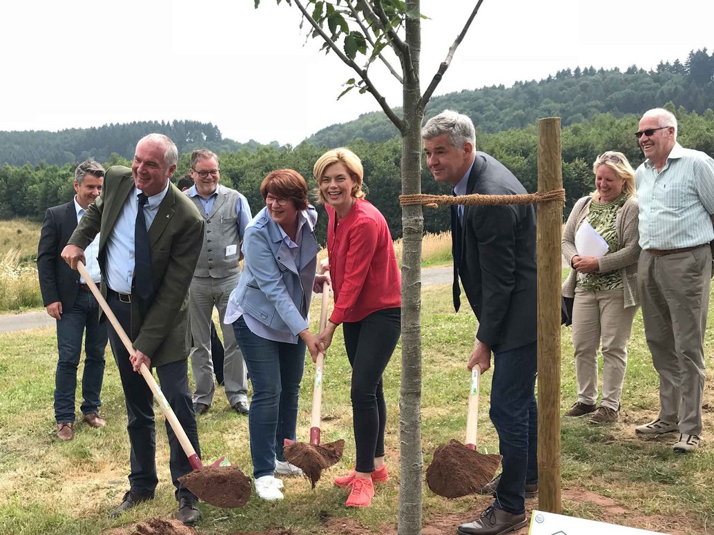 Bundeslandwirtschaftsministerin Julia Klöckner (Mitte re.) pflanzt mit Antje Lezius (Mitglied des Bundestages, Mitte li.), Helmut Selders (Präsident des Bundes deutscher Baumschulen, li.) und Dr. Matthias Schneider (Landrat, re.) den Baum des Jahres 2018, eine Ess-Kastanie. Foto: BdB