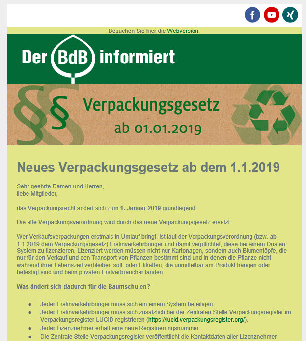 Der BdB hat am 19. November alle BdB-Mitglieder per Newsletter informiert und alle Fragen zur Lizenzierung und Registrierung beantwortet. Zum Nachlesen wurden diese Infos im internen passwortgeschützten Mitgliederbereich der BdB-Homepage in der Rubrik „Rechtliches/Transport und Verkehr“ (Menüunterpunkt "Neue Verpackungsverordnung ab dem 1.1.2019") abgelegt. Hier finden Mitglieder auch die Links zur Landbell-Internetseite sowie zur Zentralen Stelle Verpackungsregister, wo man sich lizenzieren sowie registrieren lassen kann.
