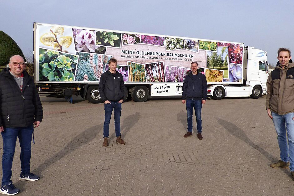 „Inspirierende Pflanzenvielfalt in ausgezeichneter Qualität“ ist in den kommenden Wochen wieder auf dem Weg vom Weser-Ems-Gebiet in die gesamte Bundesrepublik bzw. Europa. Stellvertretend für die 160 Mitglieder des Baumschulverbandes begleiteten Jan-Gerd Bruns, Fokko zur Mühlen und Jochen Stöckmann die erste Beladung des neuen LKWs auf dem Versandhof der Baumschule Bruns in Bad Zwischenahn. Mit dabei war auch TTH-Speditionsinhaber Stephan Hansel.