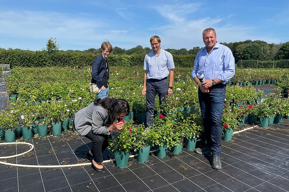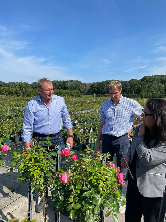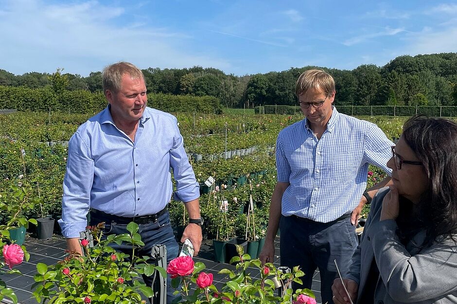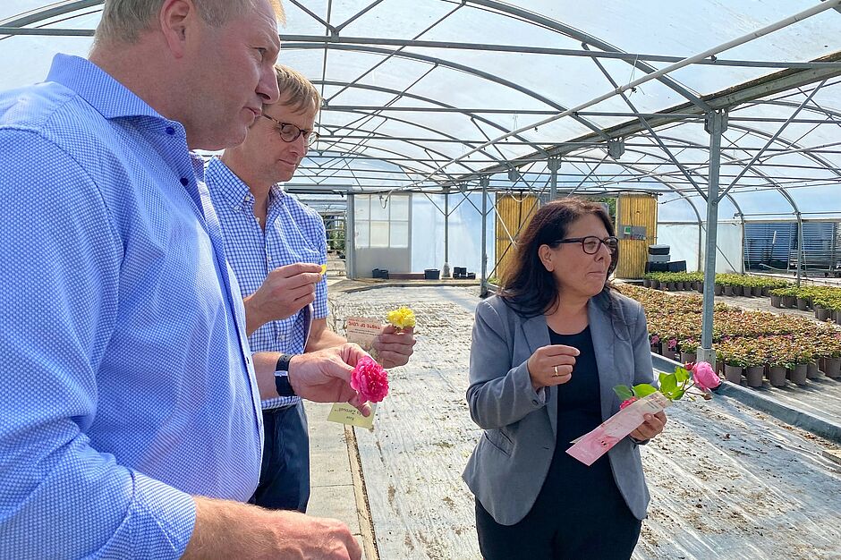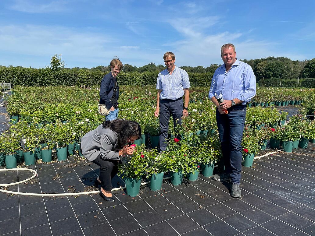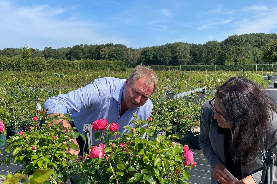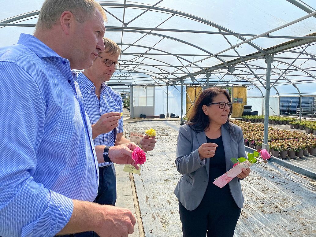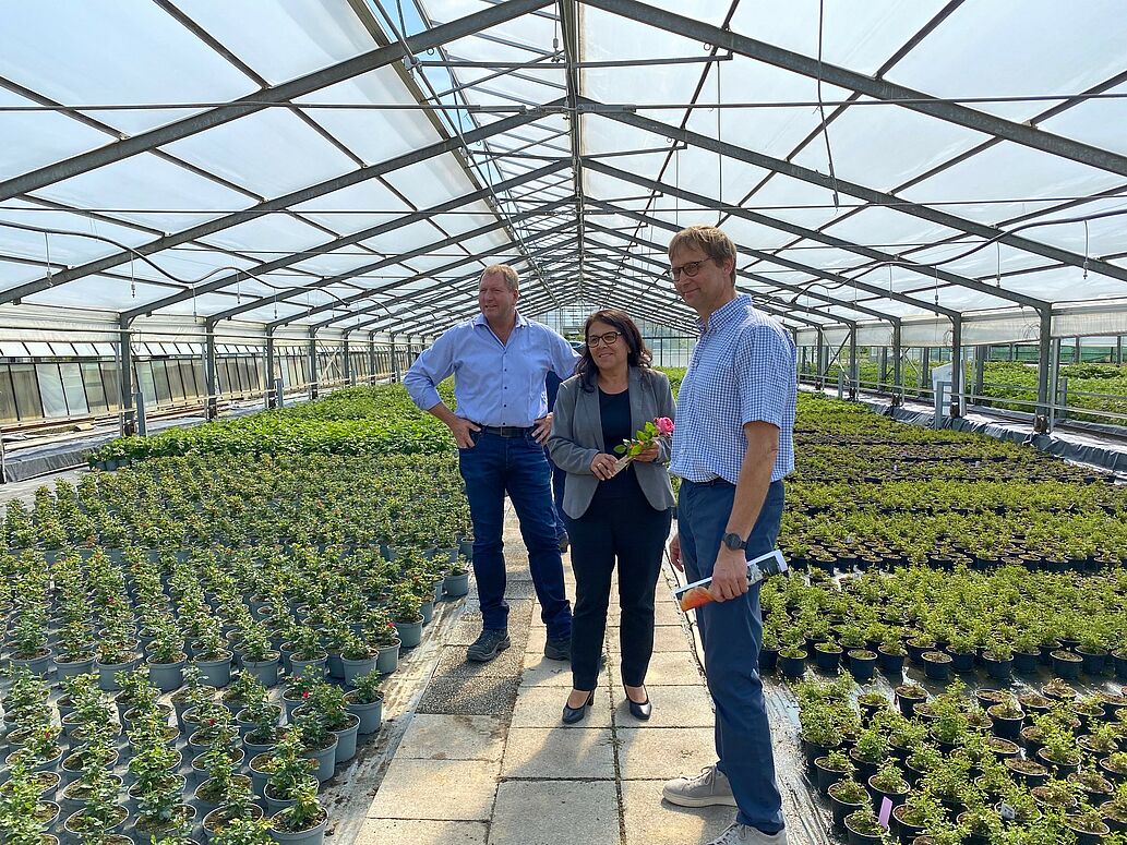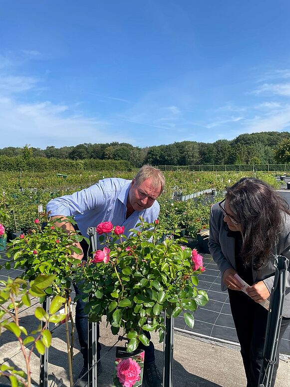 Gülistan Yüksel - Mitglied des Bundestages, stellvertretende Sprecherin der SPD für Migration und Integration, sowie Christoph Dirksen, Vorsitzender des Landesverbands NRW, haben am gestrigen Dienstag zusammen die Baumschule Weber Rosen (Mönchengladbach) von Harald Hallen besucht. Die Anwesenden haben sich nach den praktischen Tätigkeiten über essbare Rosen, biologischen Pflanzenschutz, Entschädigungsfonds, bürokratische Hürden, steuerfreie Risikorücklagen, Fachkräftemangel sowie die ADR - Allgemeine Deutsche Rosenneuheitenprüfung ausgetauscht. Christin Haack, Geschäftsführerin des Landesverbandes NRW sowie Marius Tegethoff vom BdB waren auch dabei.