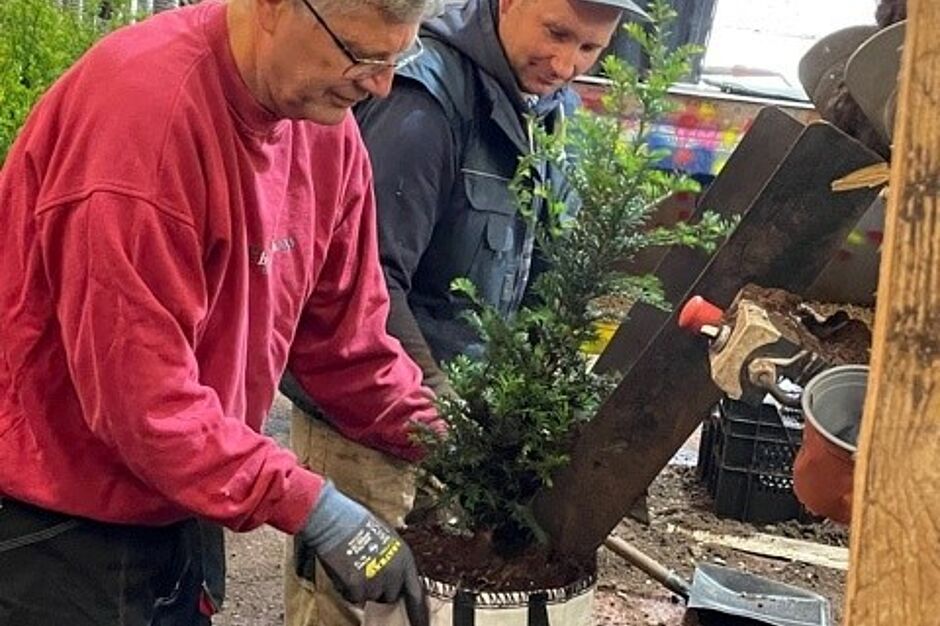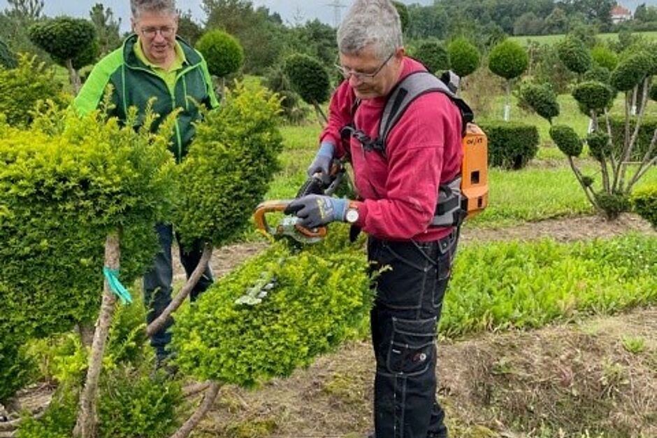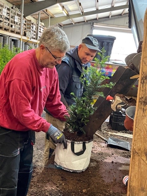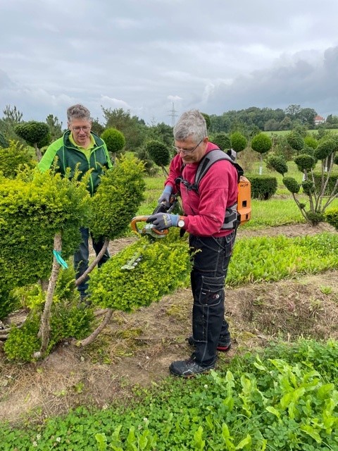 Auch die Problematik der Quarantäneschadorganismen sowie notwendige Maßnahmen wurden thematisiert. Herr Puchert topfte u.a. mit Frau Schimke bei bestem Wetter eine Vielzahl junger Lebensbäume und zeigte Ihr Schritt für Schritt typische Veredelungstechniken.