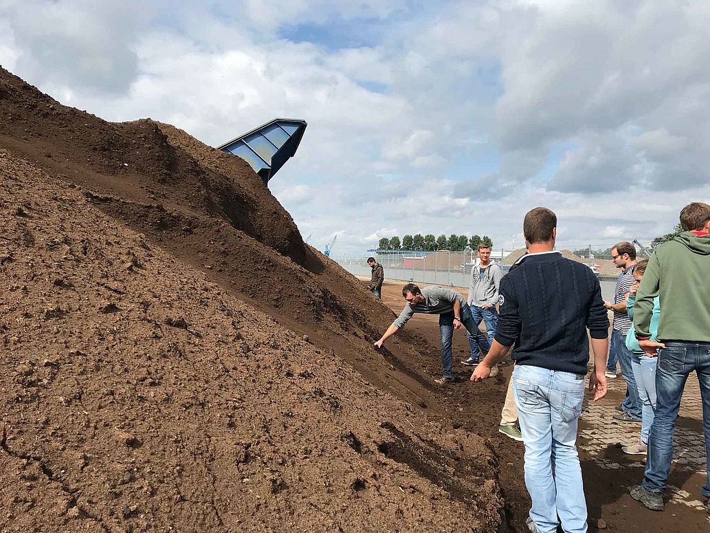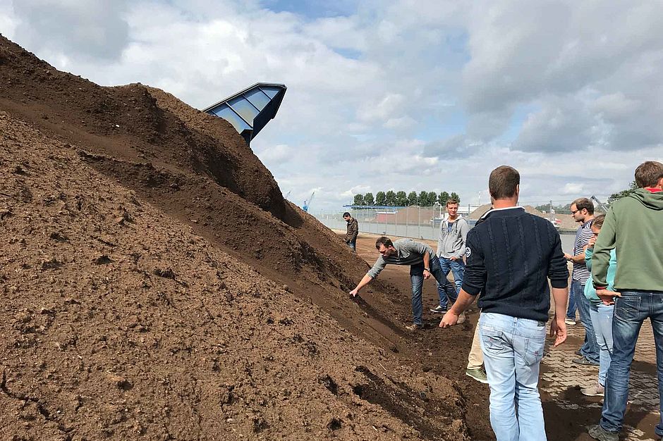 Hier konnten sich die Teilnehmer einen Überblick über die hervorragende Qualität der Ausgangsstoffe für gärtnerische Substrate, für Profis wie auch für Privatpersonen, überzeugen. Herr Jäger zeigte den Teilnehmern dabei auf, dass im Prinzip für jeden Kundenwunsch gezielte Mischungen hergestellt werden können. Er empfahl in diesem Zusammenhang, dass man auch auf die langjährige Erfahrung des Betriebes zurückgreifen könne. Die Nähe zur Meyer Werft sowie die diesjährige, extreme Trockenperiode machten es unerlässlich, die einzelnen Rohstoffe permanent feucht zu halten, da andernfalls eine Verwehung der Substrate in nahgelagerte Bereiche drohte. Die enge Taktung im Schifffahrtsverkehr haben zunehmend die Anlieferung von neuer Ware per Schiff erschwert.