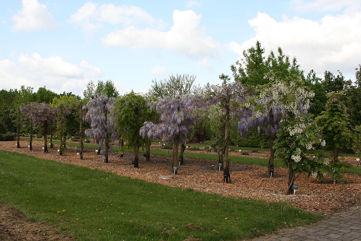 Der Tradition langer Feldversuche folgend, widmet sich der Standort Dresden Pillnitz langfristiger Sichtungen im Bereich von Wisteria-Sorten. Das Foto lässt schnell erahnen, wie komplex Wisteria in seinen Ausprägungen, z.B. von Blüten oder Winterhärte, ist. In voller Blüte lockt der Blauregen nur allzu oft Hobbygärtner in die Versuchsanlage.