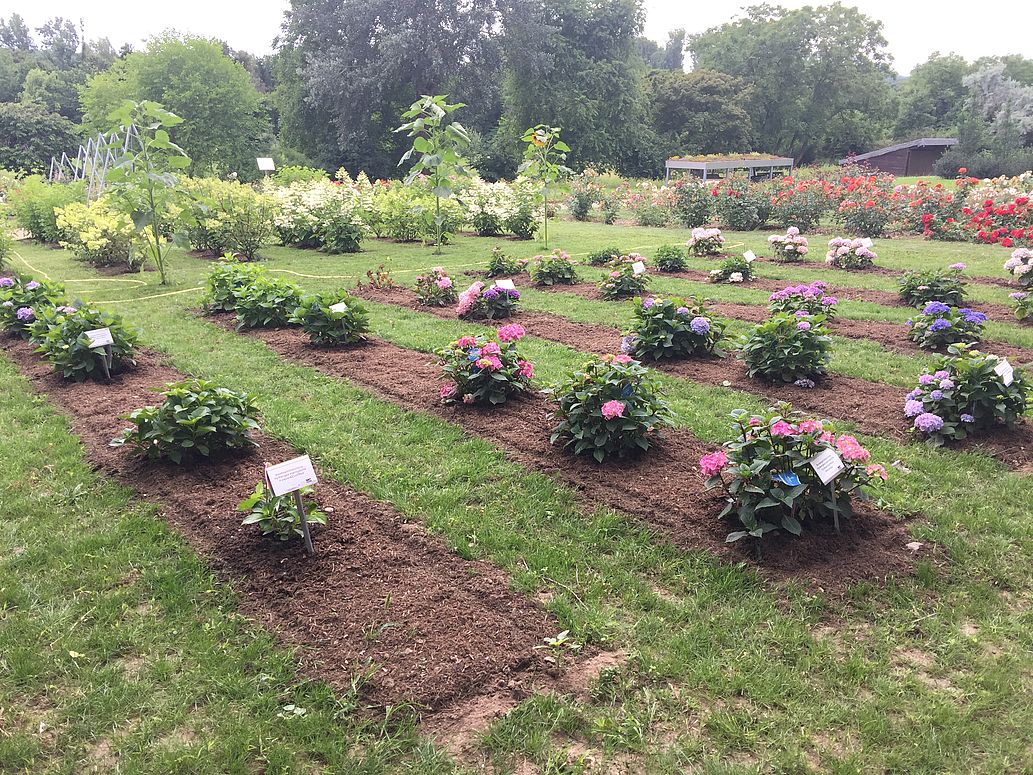 Derzeit werden hier ADR-Prüfsorten, Wisterien, Hydrangea paniculata und Hydrangea macrophylla im Rahmen der bundesweiten Sichtung geprüft; darüber hinaus werden Sortimente von Ilex x meserveae und Edelrosen nach Ablauf der offiziellen Sichtung weiter beobachtet.