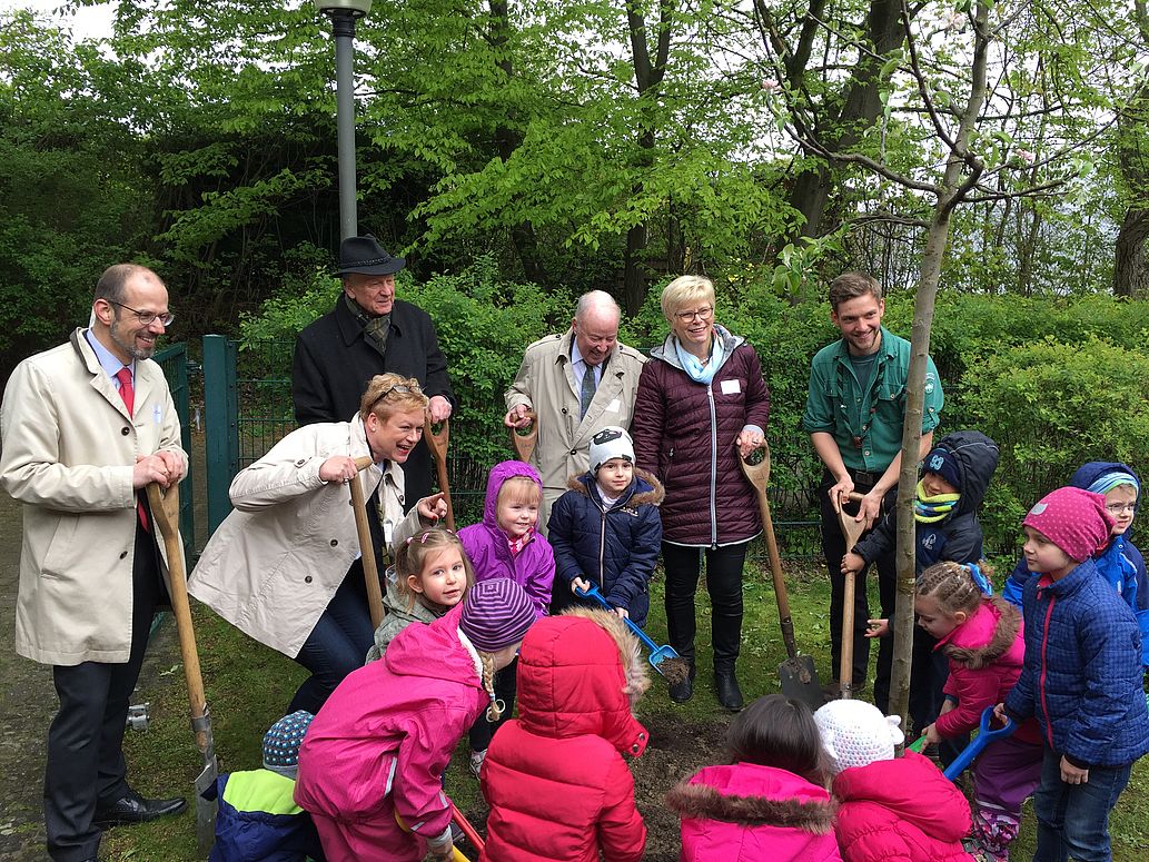 Zum heutigen Tag des Baumes stiftete der Bund deutscher Baum-schulen (BdB) e.V. einen Apfelbaum zur Baumpflanzung mit der Schutzgemeinschaft Deutscher Wald (SDW) und dem Staatssekretär im Bundesministerium für Ernährung und Landwirtschaft (BMEL), Dr. Hermann Onko Aeikens in einer Berliner Kindertagesstätte.