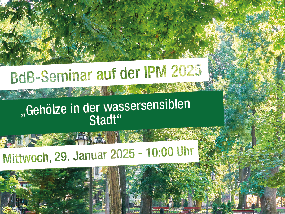 Wir laden Sie herzlich ein zu unserem Seminar "Gehölze in der wassersensiblen Stadt" am 29. Januar 2025 um 10:00 Uhr auf der IPM Essen. Im Anschluss an das Seminar freuen wir uns auf einen regen Austausch bei einem Mittagsimbiss.