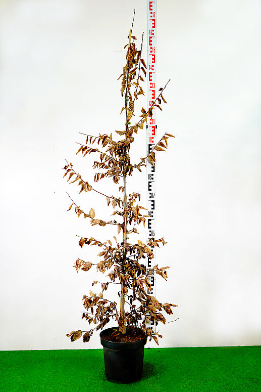 Heckenpflanzen aus baumartig wachsenden Gehölzen müssen von den Baumschulen frühzeitig während ihrer Anzucht für ihre spätere Verwendung vorbereitet werden. Hierzu müssen Heckenpflanzen aus baumartig wachsenden Gehölzen mindestens zweimal geschnitten worden sein. Ähnlich wie bei Hochstämmen wird ein gerader, artspezifischer Mitteltrieb benötigt, von welchem über einen Großteil der Strecke Verzweigungen hervorgehen müssen. Schließlich wird die Beastung für das geschlossene Bild einer Hecke benötigt. Bild 01 zeigt eine Carpinus betulus als Heckenpflanze 2xv. TL-konform weist diese Hainbuche eine über den gesamten Mitteltrieb gehende Garnitur mit Seitentrieben auf. Auch auf Bild 02 ist die Konformität bei Acer campestre gegeben. Während Carpinus betulus im Container angeboten wurde, wurde die Acer campestre als Ballenware produziert. Beide Verfahren sind in diesem Fall zulässig. Die Sortierung von Heckenpflanzen 2xv erfolgt nach Pflanzenhöhe. Entsprechende Vorgaben können dem BKS-Artikelstamm entnommen werden.