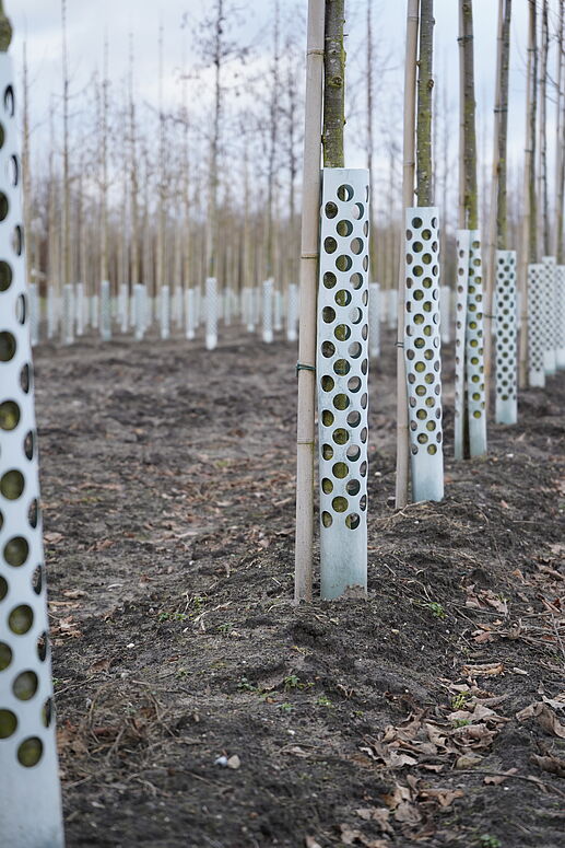 Junge Gehölze sind auf vielfältige Weise durch verschiedene Einflüsse bedroht. Nur zu gerne fressen diverse Wildtiere an der Rinde von Bäumen und Sträuchern. Die verletzten Gehölze können sich durch teilweise schwerwiegende Verletzungen nur schwer erholen. Aus diesem Grund bringen Baumschulen z.B. an Hochstämmen einen entsprechenden Wildschutz aus Kunststoff am Stamm an. Auf diese Weise können z.B. Feldhasen nicht mehr an der Rinde nagen.