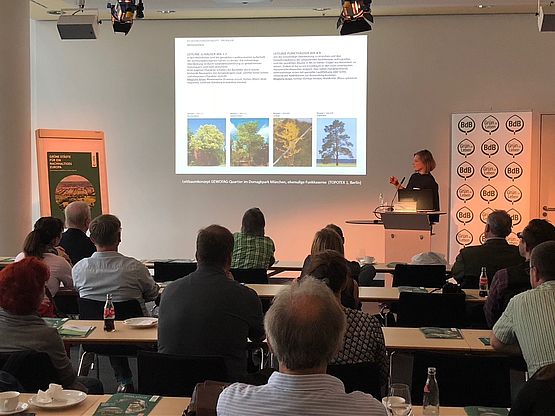 Auch Prof. Dr. Swantje Duthweiler von der Hochschule Weihenstephan-Triesdorf rief in ihrem Vortrag zu urbanen Pflanzkonzepten dazu auf, die Versiegelung von Flächen zu vermeiden und die Entsiegelung voranzutreiben: „Es ist generell wichtig, für mehr Stadtgrün einzutreten, aber es ist ebenfalls von größter Bedeutung, dieses Stadtgrün hochwertig und sachgerecht anzulegen, damit es lange einen Nutzen hat.“ In dicht besiedelten Gebieten eigneten sich mehrere kleine Grünflächen insbesondere dort, wo größere Parks weiter weg seien: „Bäume sind aufgrund ihrer Schattenwirkung und Filterleistung hocheffizient für das Stadtklima.“