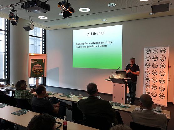 Prof. Dr. Dirk Dujesiefken vom Institut für Baumpflege ging in seinem Vortrag über die Perspektiven für ein zukunftsfähiges Stadtgrün auf die Probleme ein, die durch Urbanisierung, Klimawandel und mangelnde Biodiversität entstehen: „Die Verteidigung der Grünflächen muss höchste Priorität haben“, forderte Dujesiefken. „Wir müssen uns von einem ‚einheitlichen‘ Bild der Bäume lösen und stattdessen verschiedene Gattungen, Arten und Sorten pflanzen, um die genetische Vielfalt zu gewährleisten.“