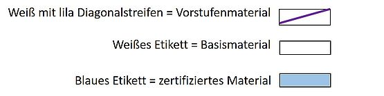 Die neue Anbaumaterialverordnung wird für die zweite Jahreshälfte 2017 erwartet. Mit dieser einhergehend wird ab 2019 die Verwendung farblicher Etiketten bei Vorstufen-, Basis- und zertifiziertem Material verpflichtend. Grundsätzlich enthielt die zugehörige Richtlinie keinen Verpflichtung zur Nutzung entsprechender Farbvorgaben, doch hat sich bereits ein Teil der EU-Mitgliedsstaaten auf eine Verwendung festgelegt. Folgende Farben wurden durch die Europäische Kommission vorgegeben.